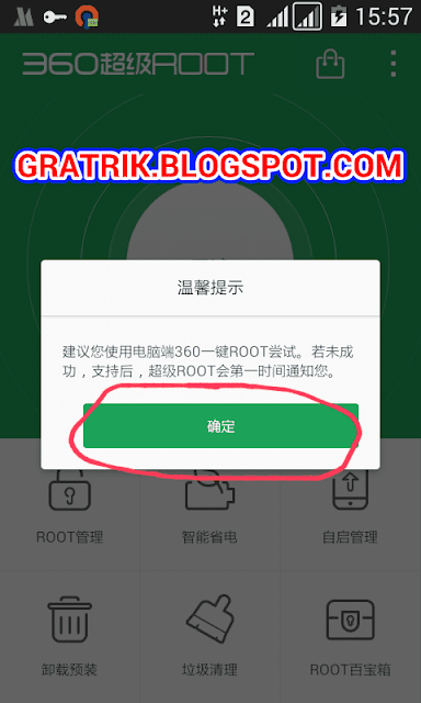 - Jika setelah proses no. 4 lingkaran tidak langsung berubah dan malah muncul pop up seperti di gambar, coba restart/reboot smartphone, lalu masuk ke 360 root lihat apa lingkarannya sudah muncul angka-angka, jika belum berarti root gagal dan harus mengulang proses root (biasanya karena faktor jaringan lemot)